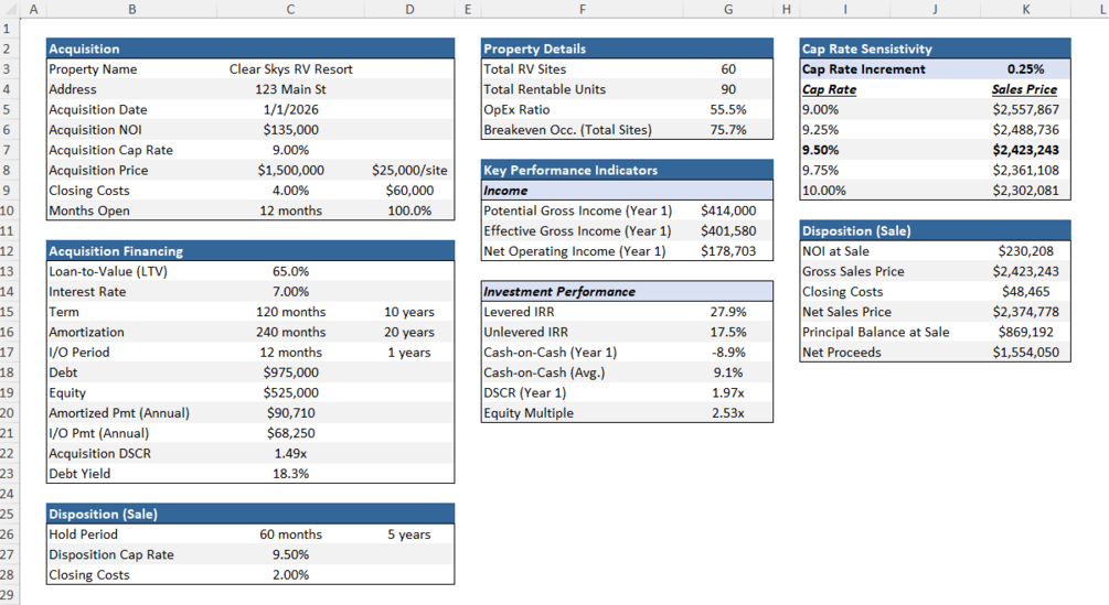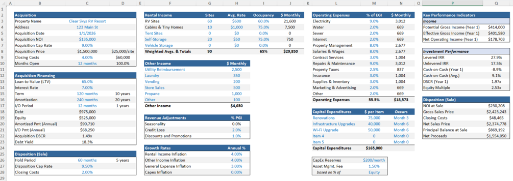 An intuitive, practical Excel model for underwriting RV park acquisitions, evaluating financing scenarios, and property performance. No macros. No circular references. No multiple input tabs. Built for investors, brokers, and owners by an actual RV park operator with over 15 years of cash flow modeling experience.