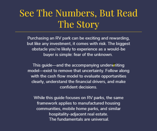 A plug-and-play Excel model for analyzing RV park investments in minutes, bundled with a concise PDF guide that explains each input to help you gut-check your assumptions.